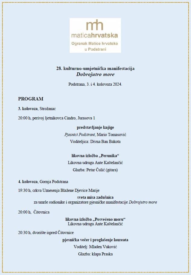 Ovogodišnja kulturno-umjetnička manifestacija Dobrojutro more koju organiziramo po 28. put održat će se: