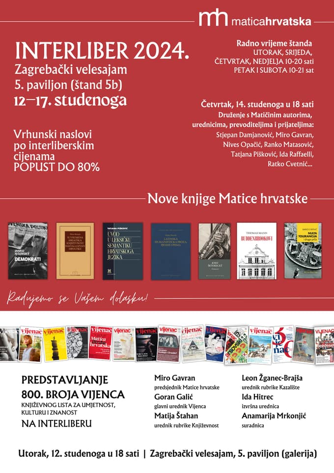 Matica hrvatska i ove godine sudjeluje na Međunarodnom sajmu knjige Interliber. U 5. paviljonu (štand 5b) posjetitelje će dočekati najbolji izbor Matičinih knjiga među kojima izdvajamo roman Demokrati (Janko Jesenský), prev. Filip Badanjak, zatim četvrtu knjigu Marulićevih izabranih djela u biblioteci Stoljeća hrvatske književnosti pod naslovom Latinska humanistička proza, pjesme i pisma priredio Bratislav Lučin te knjigu Milana Bošnjaka Suvremena hrvatska književnost nastala izvan Hrvatske – članci i ogledi.